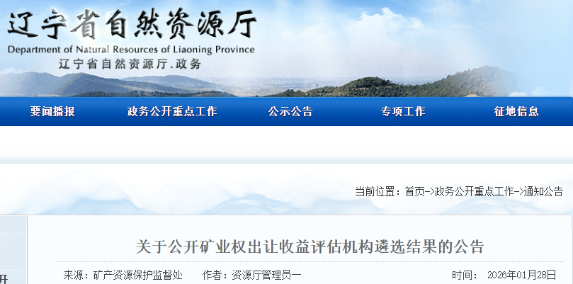 按照《遼寧省自然資源廳關(guān)于公開遴選礦業(yè)權(quán)出讓收益評(píng)估機(jī)構(gòu)的公告》要求,經(jīng)綜合評(píng)定,確定2026年省級(jí)礦業(yè)權(quán)出讓收益評(píng)估機(jī)構(gòu)入圍名單如下,特此公告。