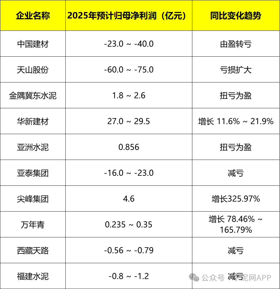 近日,多家水泥企業(yè)2025年度業(yè)績預(yù)報發(fā)布,具體見下: