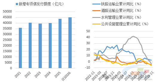 基建方面,我們判斷2026年投資將回正,基建端水泥需求將有改善。“十五五”規(guī)劃建議指出,加強謀劃論證,實施一批重大標(biāo)志性工程項目,高質(zhì)量推進(jìn)國家重大戰(zhàn)略實施和重點領(lǐng)域安全能力項目建設(shè)。2026年作為“十五五”開局之年,預(yù)計專項債、超長期特別國債發(fā)行規(guī)模將出現(xiàn)提高,基建投資將出現(xiàn)回正,但在化債政策影響下,水泥需求關(guān)系密切的交通類和市政基建投資或?qū)⒀永m(xù)低迷態(tài)勢,預(yù)計基建整體對水泥需求支撐將有所改善,但力度可能仍然不強。