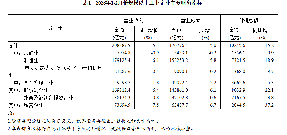 1—2月份,全國規(guī)模以上工業(yè)企業(yè)實(shí)現(xiàn)利潤總額10245.6億元,同比增長15.2%(按可比口徑計(jì)算,詳見附注二)。
