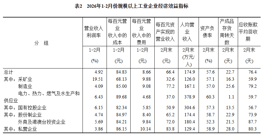 1—2月份,規(guī)模以上工業(yè)企業(yè)實(shí)現(xiàn)營業(yè)收入20.84萬億元,同比增長5.3%;發(fā)生營業(yè)成本17.68萬億元,增長5.0%;營業(yè)收入利潤率為4.92%,同比上升0.43個(gè)百分點(diǎn)。