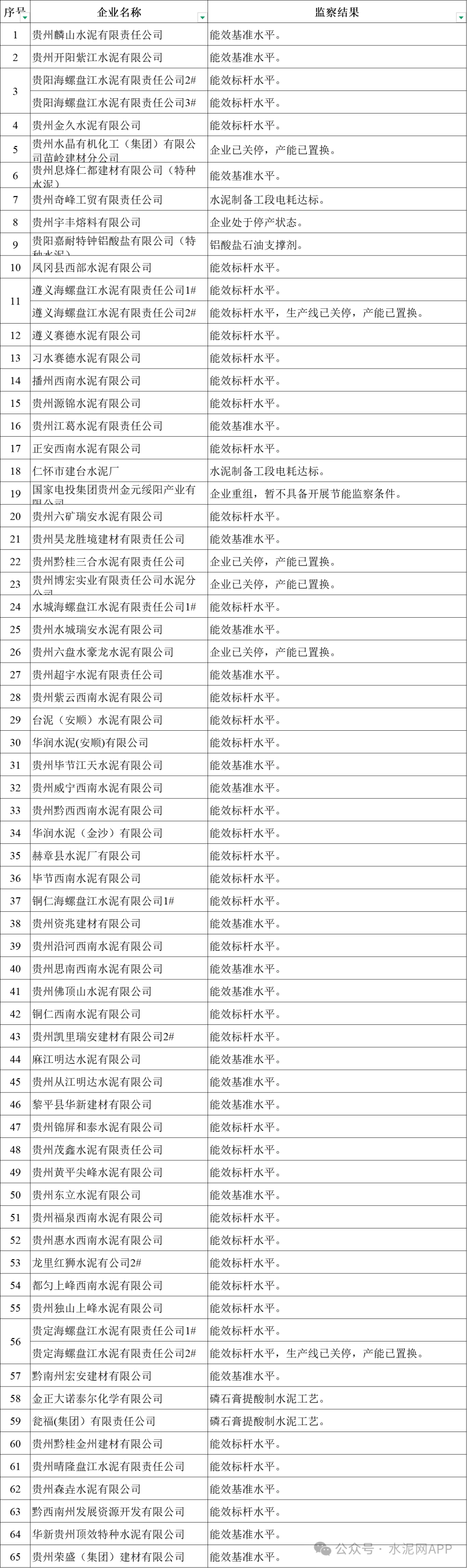 其中水泥企業(yè)共計(jì)65家,達(dá)到能效基準(zhǔn)水平的共計(jì)20家,達(dá)到能效標(biāo)桿水平的共計(jì)37家。具體見下表: