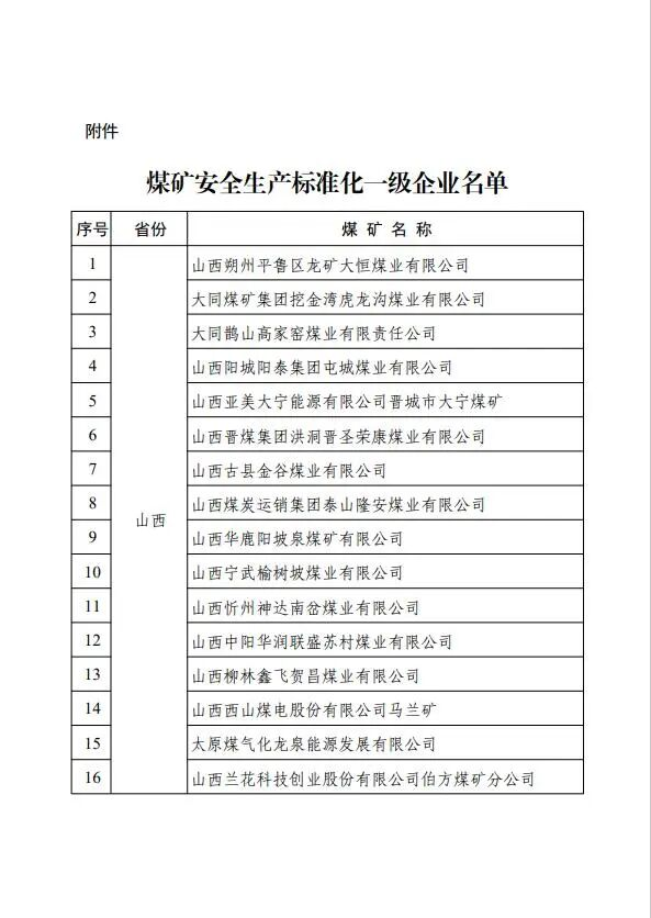 根據(jù)中央層面達標活動清單,按照《煤礦安全生產(chǎn)標準化管理體系考核定級辦法》(礦安〔2024〕109號)等規(guī)定,經(jīng)資料審查、現(xiàn)場檢查抽查、網(wǎng)上公示,認定山西朔州平魯區(qū)龍礦大恒煤業(yè)有限公司等52處煤礦(詳見附件)為煤礦安全生產(chǎn)標準化一級企業(yè),現(xiàn)予以公告。本認定自公告之日起生效,有效期為3年。