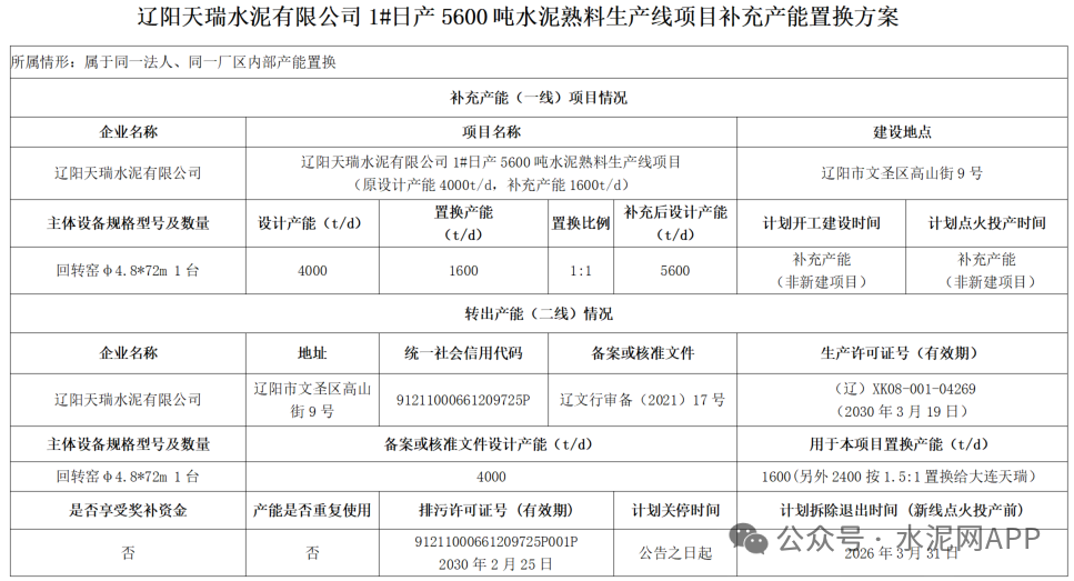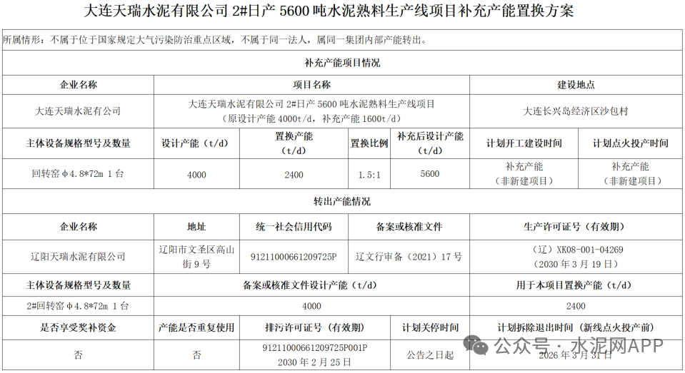 2026年1月16日,我廳按照工業(yè)和信息化部《水泥玻璃行業(yè)產(chǎn)能置換實(shí)施辦法》(工信部原〔2024〕206號(hào))有關(guān)規(guī)定及水泥行業(yè)產(chǎn)能管理相關(guān)政策要求,對遼陽天瑞水泥有限公司1#日產(chǎn)5600噸、大連天瑞水泥有限公司2#日產(chǎn)5600噸水泥熟料生產(chǎn)線生產(chǎn)線補(bǔ)充產(chǎn)能置換方案進(jìn)行了公告,用于置換的退出產(chǎn)能為遼陽天瑞水泥有限公司2#日產(chǎn)4000噸水泥熟料生產(chǎn)線產(chǎn)能。