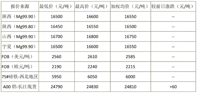 2. 原鎂報(bào)價(jià)為按照?qǐng)?bào)價(jià)企業(yè)產(chǎn)量加權(quán)計(jì)算后所得平均值,并按50元/噸取整;3. 表中價(jià)格均為現(xiàn)貨含稅、現(xiàn)金、不酸洗價(jià),國內(nèi)單位為元/噸;4. FOB為天津港離岸價(jià)格。