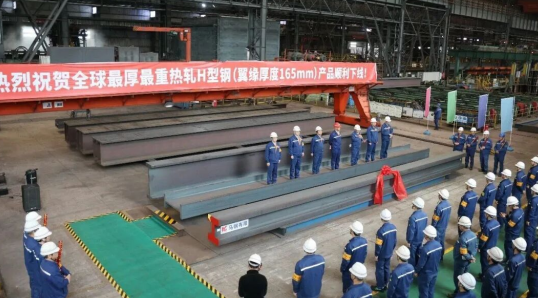 4月21日,馬鋼有限H型鋼產線攻克行業(yè)技術難題,全球最厚最重熱軋H型鋼產品順利下線。此次下線的熱軋型鋼產品翼緣厚度達165毫米,米重1509千克,是當前全球最厚、最重的熱軋H型鋼,馬鋼有限也成為全球唯一具備該規(guī)格產品供貨能力的企業(yè),彰顯出企業(yè)頂尖的裝備技術與先進工藝水平,助力中國鋼鐵領跑全球高端型材領域。