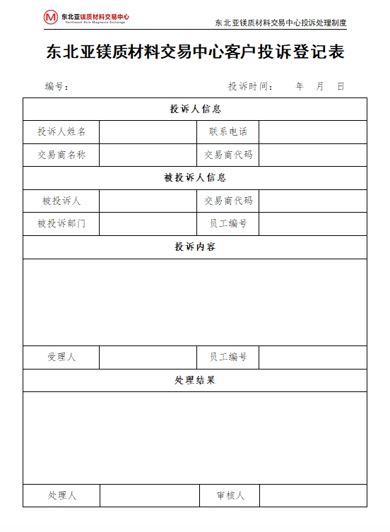 第一條 為有效管理東北亞鎂質(zhì)材料交易中心(以下簡稱“交易中心”)交易商投訴事宜,特制定本制度。